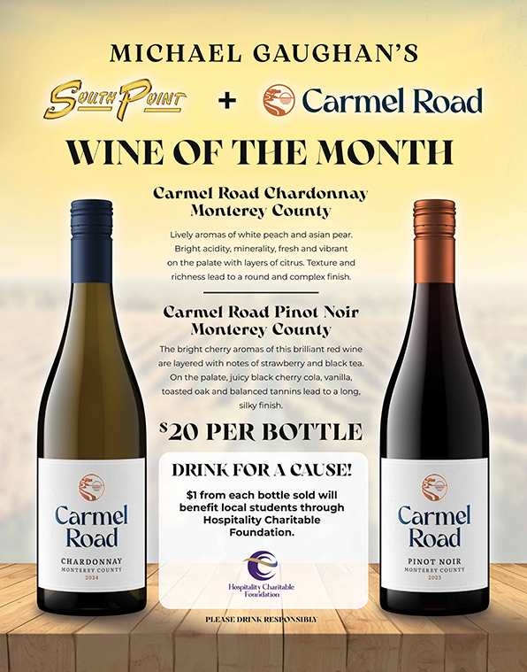 We invite you to enjoy South Point Hotel Casino & Spa’s “Wine of the Month” special and give back to Hospitality Charitable Foundation! Through the months of March and April you can purchase bottles of Carmel Road Chardonnay & Pinot Noir Monterey County for only $20 per bottle. $1 of each purchase will be donated to HCF.