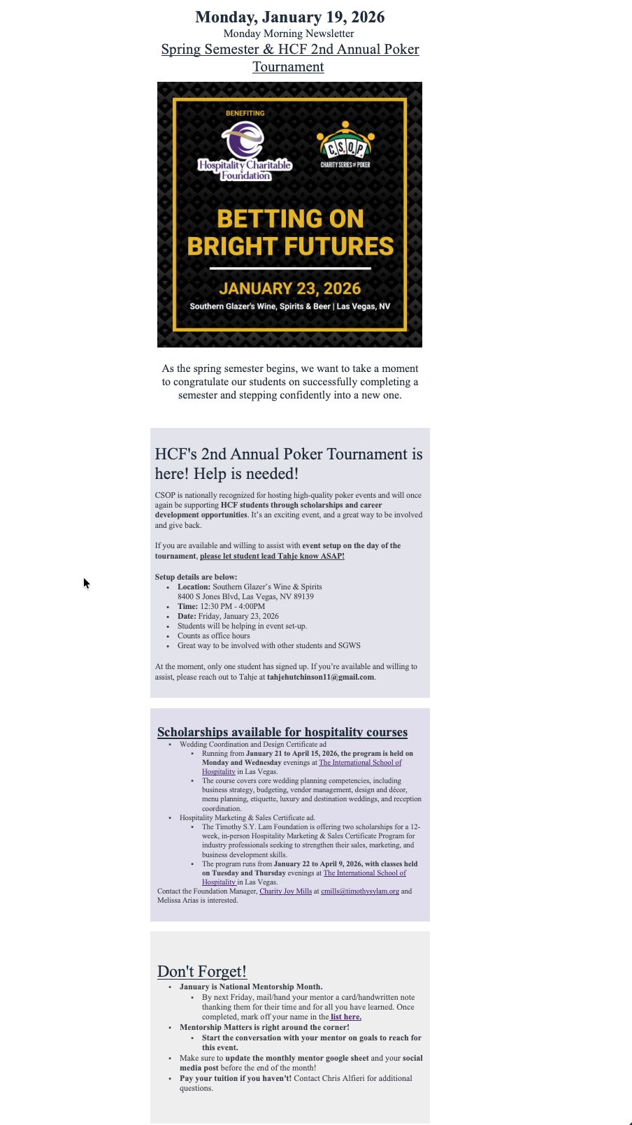Spring Semester and HCF 2nd Annual Poker Tournament